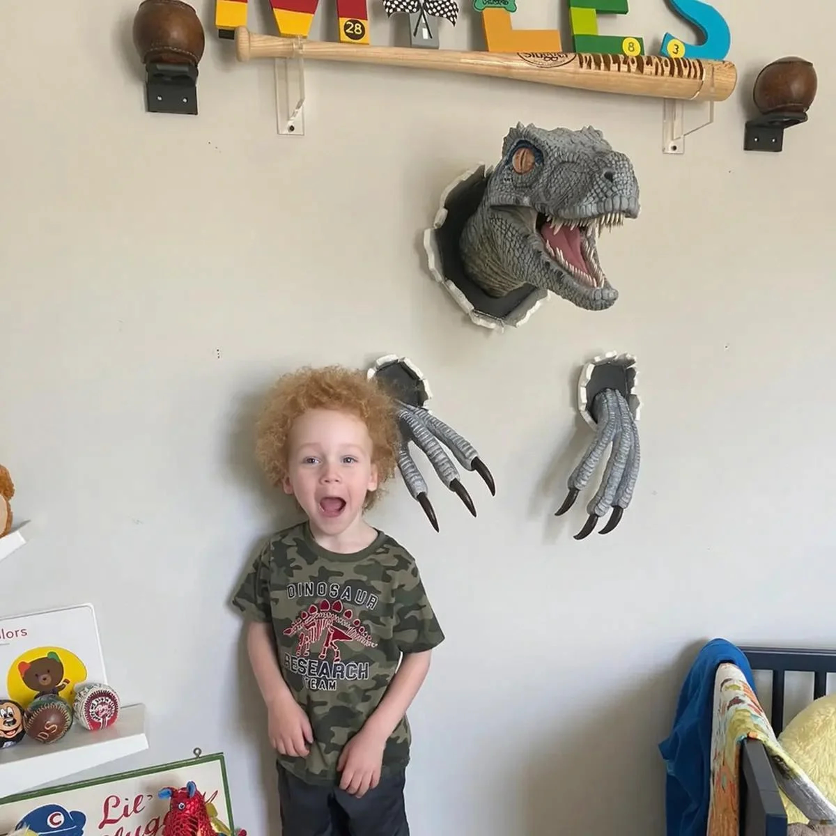 This blue Velociraptor prop replica, bursting through the wall, will completely transform your spatial experience. Its highly realistic simulation texture and 3D design of sharp claw marks tearing through the wall surface will make everyone who steps into the room gasp in awe.